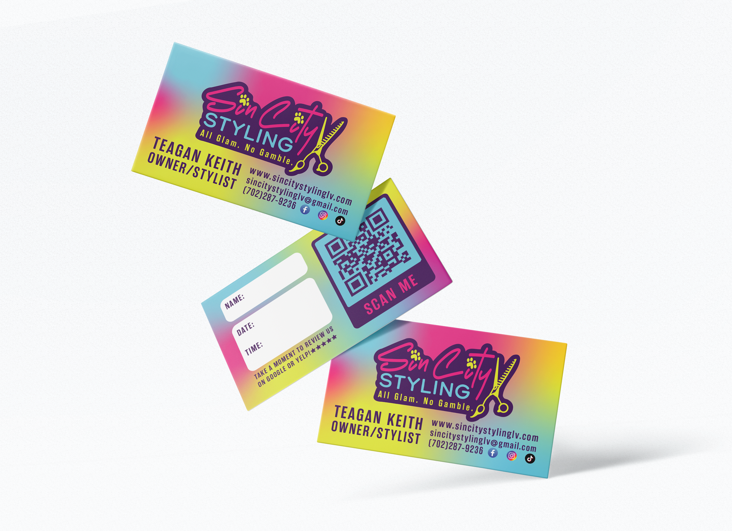 When I was hired on for this project, the name “Sin City Styling” had been finalized, but there was a struggle with deciding on the color palette, type, and imagery. I was told going into this project that the owner wanted to capture the energy and brightness of the Strip at night, so I looked to modern casino neon signs for my inspiration. At some point, the business owner sent me a photo of her own work sneakers to use as the basis for the pink, blue and yellow neons.