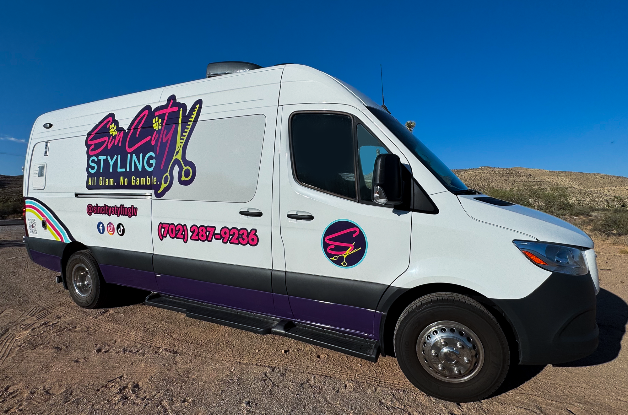 I focused on using type that would be legible from a distance and readable to anyone the van passes by. Emphasis was placed on Sin City through hierarchy, color, and the use of a script-like typeface reminiscent of casino signs. Since the name and motto of the company could be easily applied to a human styling company, I decided to introduce the paw prints and grooming shears to help establish the brand is for pets.